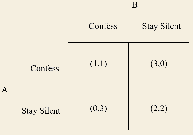 To analyse the ill effects of biopiracy, the most famous of all games, the Prisoner’s Dilemma, must be understood. Suppose the police have detained two individuals they suspect have committed a crime together but lack the evidence to convict. They give each person, kept in separate rooms, the option to confess or stay silent. If both confess, each will be sentenced to five years in prison (1). If one confesses and the other remains silent, then the former will go free (3), while the latter gets sentenced to 10 years (0Howeverer, if both remain silent, then each will be sentenced to 2 years (2), based on adequate evidence of the getaway car’s theft. Suppose the subjective (ordinal) utility functions of both players are the same, where payoffs corresponding to outcomes are given in the parentheses above. The matrix depicting this game is as follows: